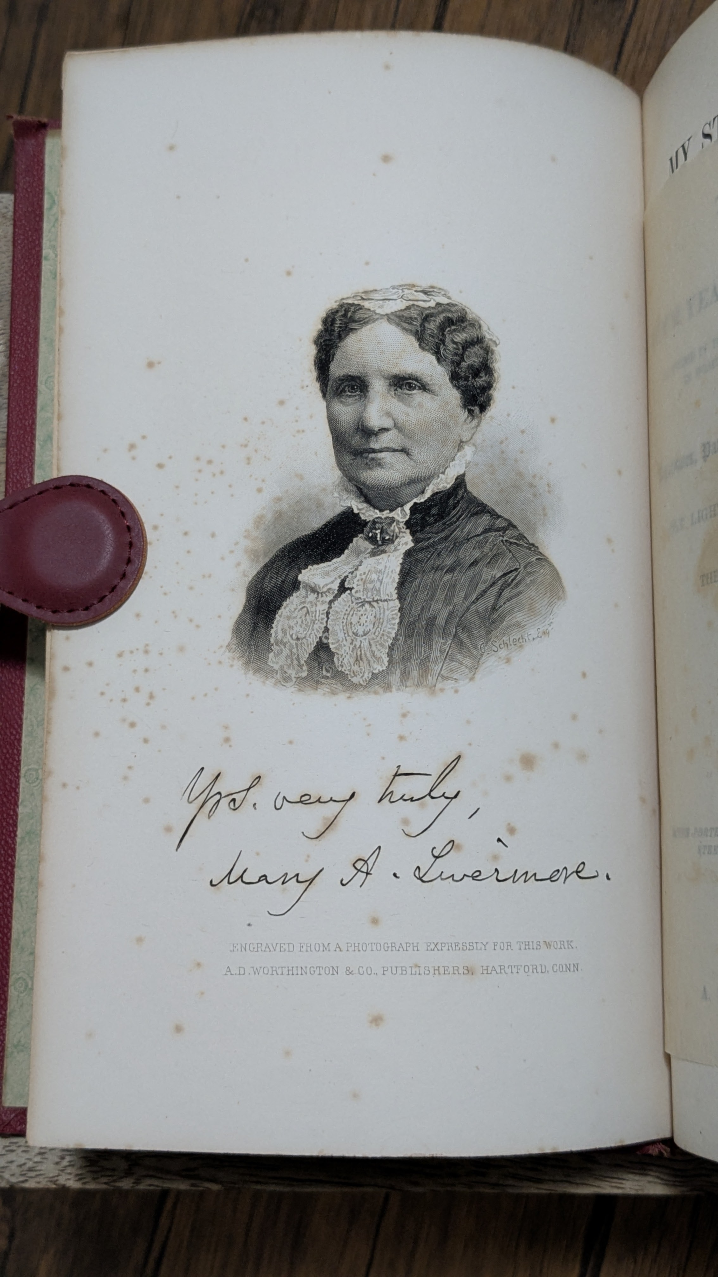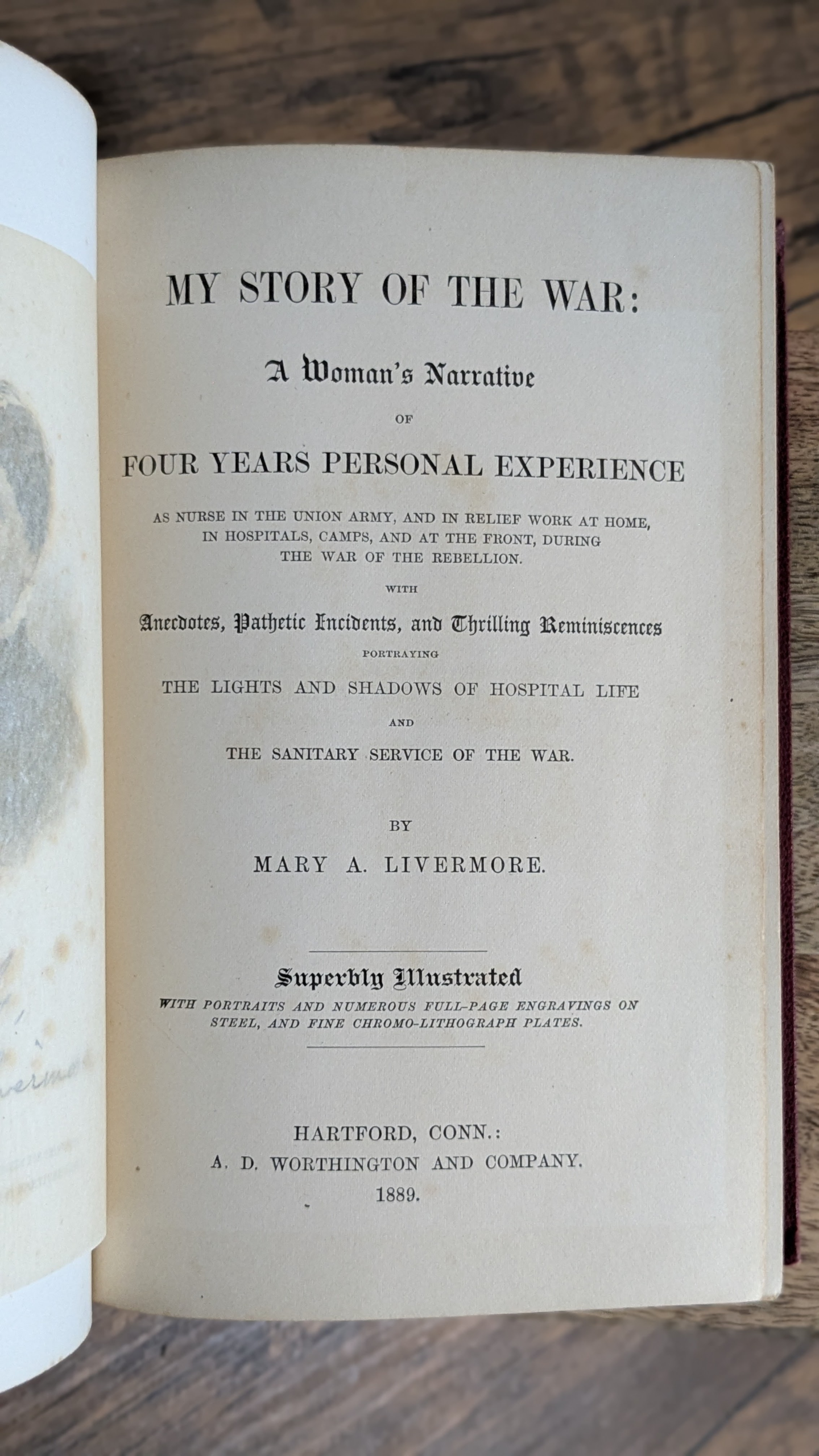 LIVERMORE, Mary A. My Story of the War. A Woman’s Narrative of Four Years’ Personal Experience as Nurse in the Union Army, and in Relief Work at Home, in Hospitals, Camps, and at the Front, during the War of the Rebellion. Hartford, Conn.: A.D. Worthington and Company, 1889.